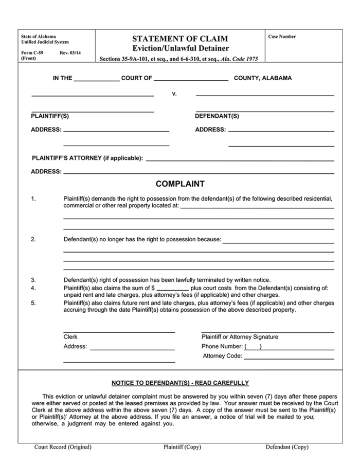 Alabama Statement Of Claim Eviction Unlawful Detainer Ezlandlordforms